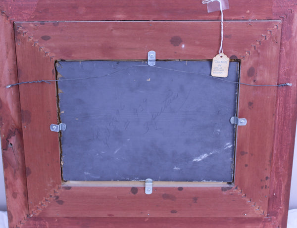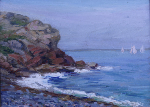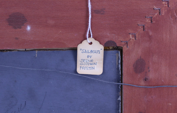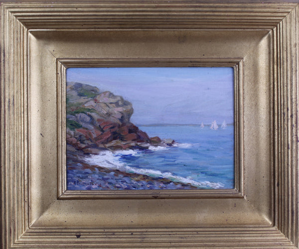 Jessie Goodwin Preston (Connecticut, born 1880), impressionistic oil on canvas-board painting of seashore and distant sailboats, signed "J. Goodwin Preston" lower-left corner. Board measures 9" x 12" and as framed 17 1/2" x 21"